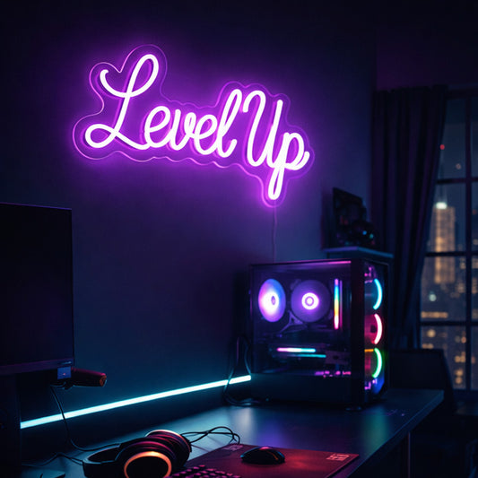 Level Up LED Neon Sign – Purple Gaming Room & Streaming Decor