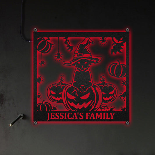Halloween Cat Wizard With Pumpkin & Spinder Personalized - Led Light Metal