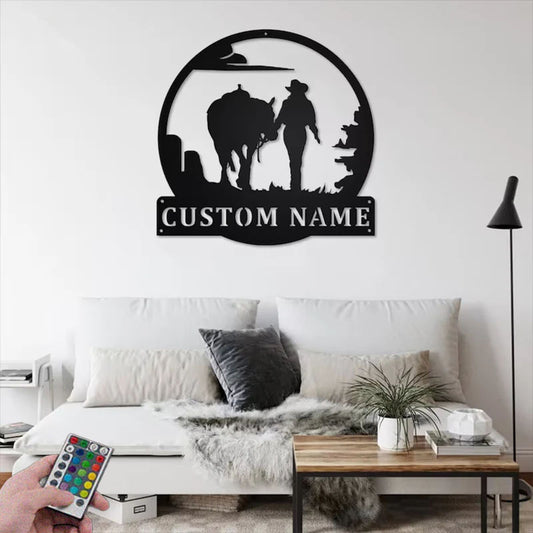 Personalized Cowgirl Walking With Horse Metal Wall Signs With RGB Led Light