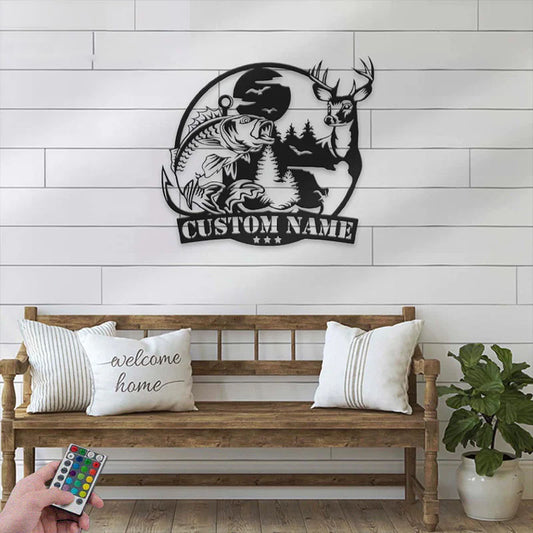 Personalized Deer Duck And Bass Fishing, Metal Wall Signs With RGB Led Light